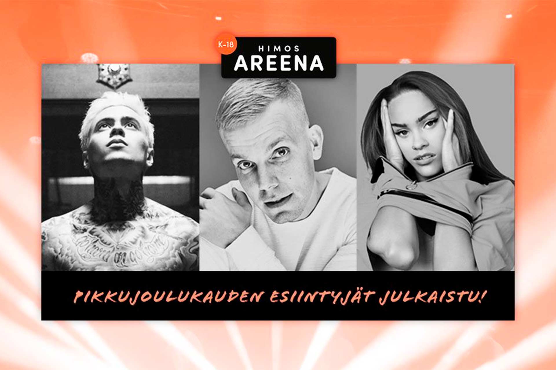 Muinakin iltoina esiintyjät ovat Suomen kärkikastista. Lavan ottavat haltuun muun muassa monitaituri ja multi-instrumentalisti Anssi Kela (27.11.) ja ysäribuumin aalloilta voimaa uralleen saanut Aikakone (6.11.). Varsinkin nuorempaa bilekansaa kiinnostavat ajankohtaiset artistit, kuten omalla musiikintekotaidollaan vakuuttanut Sanni (7.11.) ja vaikeitakin asioita kappaleillaan käsittelevä Mikael Gabriel (5.12.). Koko Himos Areenan bilekattaus löytyy täältä».